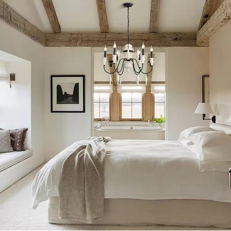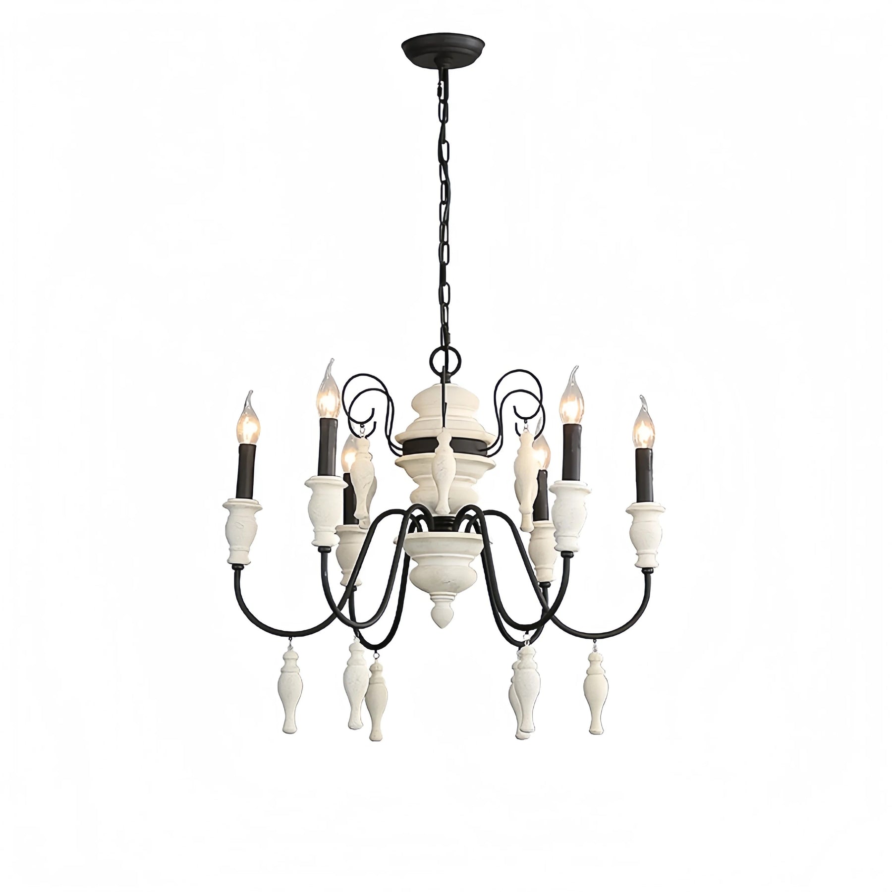 This vintage chandelier features elegant white and black accents, adding a classic touch with its six light fixtures and timeless design, perfect for rustic and country-style interiors.
