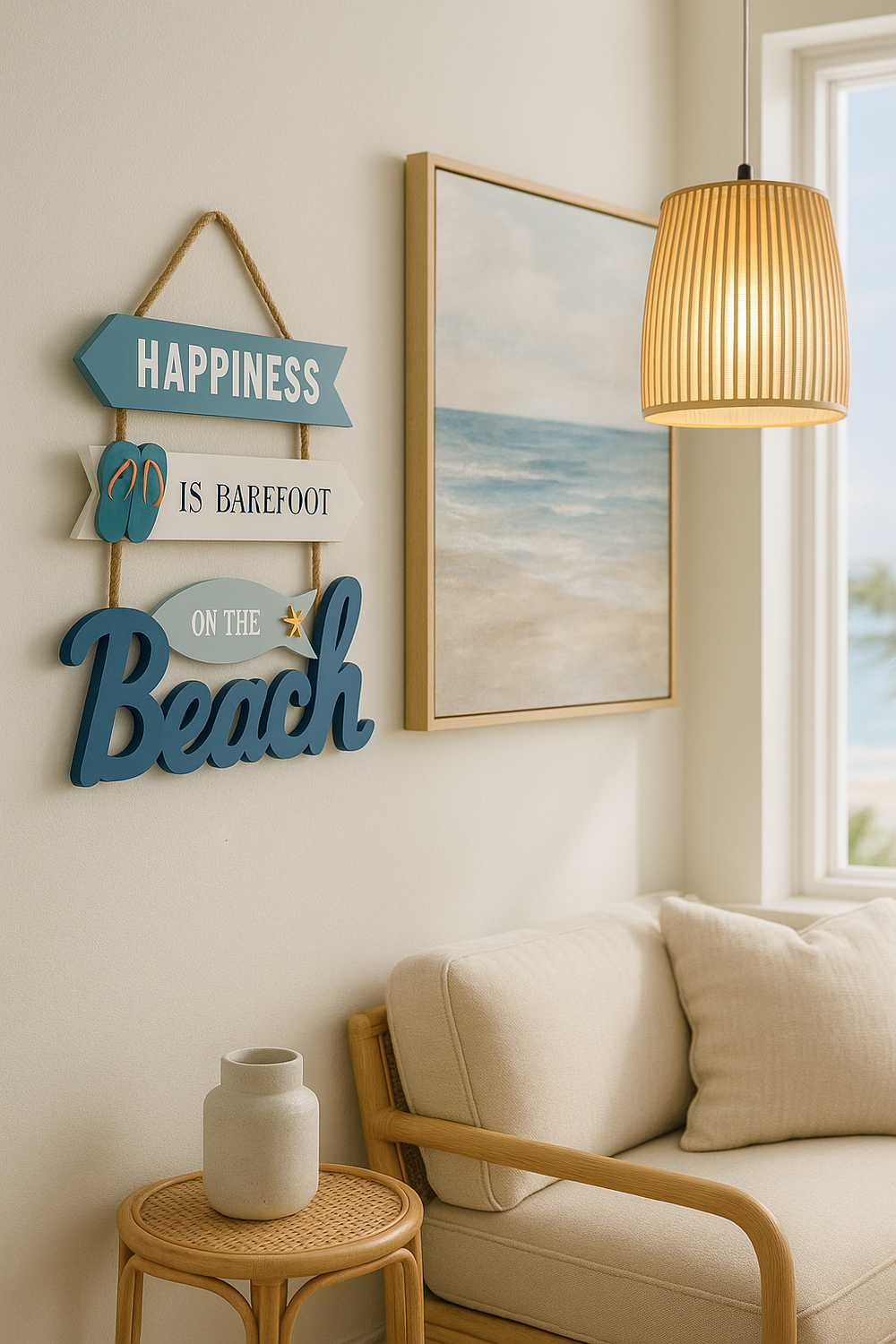 Bring a cheerful coastal vibe to your home with this charming wooden wall sign that reads, “Happiness is Barefoot on the Beach.” Designed in soothing shades of blue and white, this decorative piece features directional arrows, playful 3D flip-flops, and a cute fish accent with a starfish. Perfect for beach houses, bathrooms, or summer-themed spaces, it hangs easily with a rustic rope and instantly evokes seaside serenity.