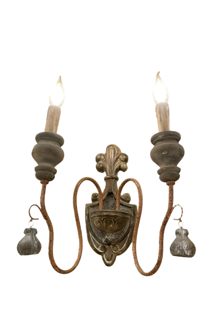 Enhance your living space with this elegant rustic wall sconce. Featuring dual arms with a weathered wood-like finish and candle-style bulbs, it adds a warm and inviting glow to any room.