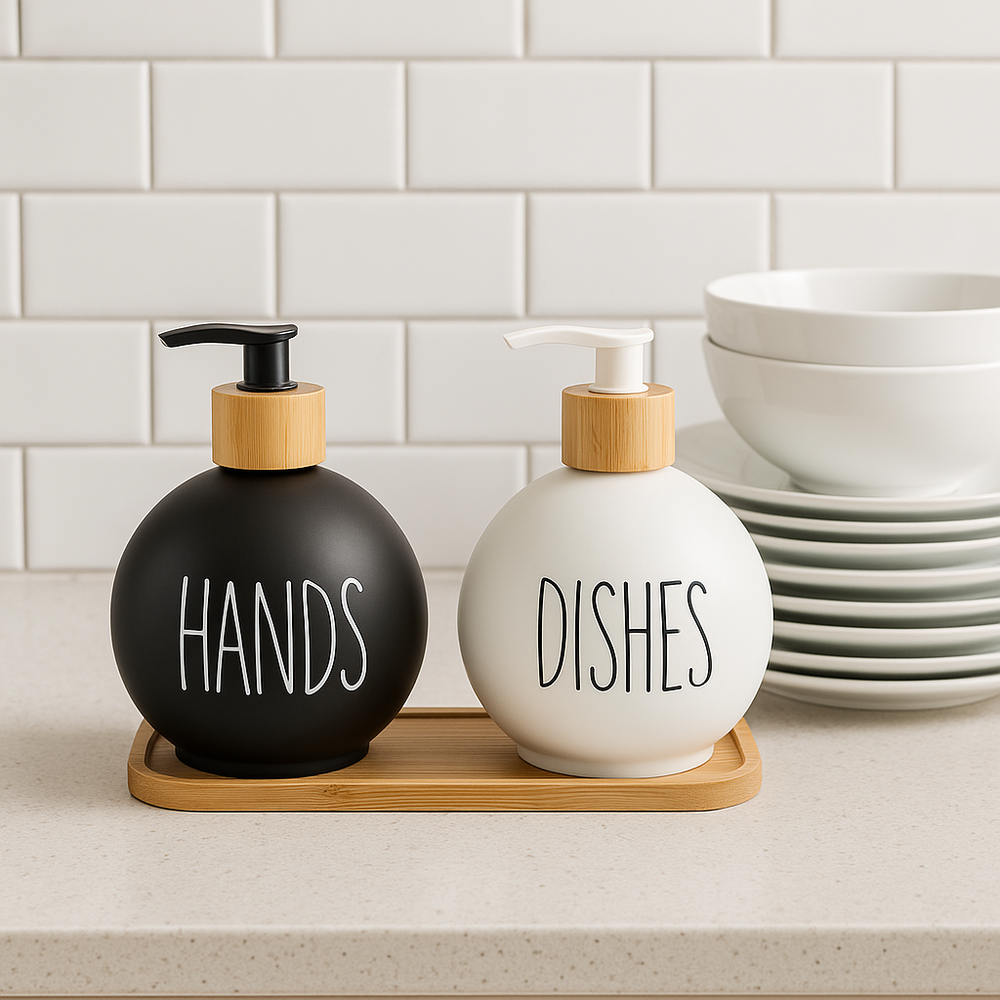 Stylishly organize your sink area with this round black and white soap dispenser set. Featuring minimalist text labels, bamboo pump tops, and a matching wooden tray, it adds modern elegance to your kitchen or bathroom.