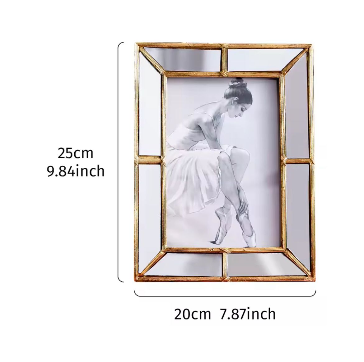 Elegant gold mirrored photo frame with geometric borders. A stylish piece to display your cherished memories while adding a modern touch to your Decor.