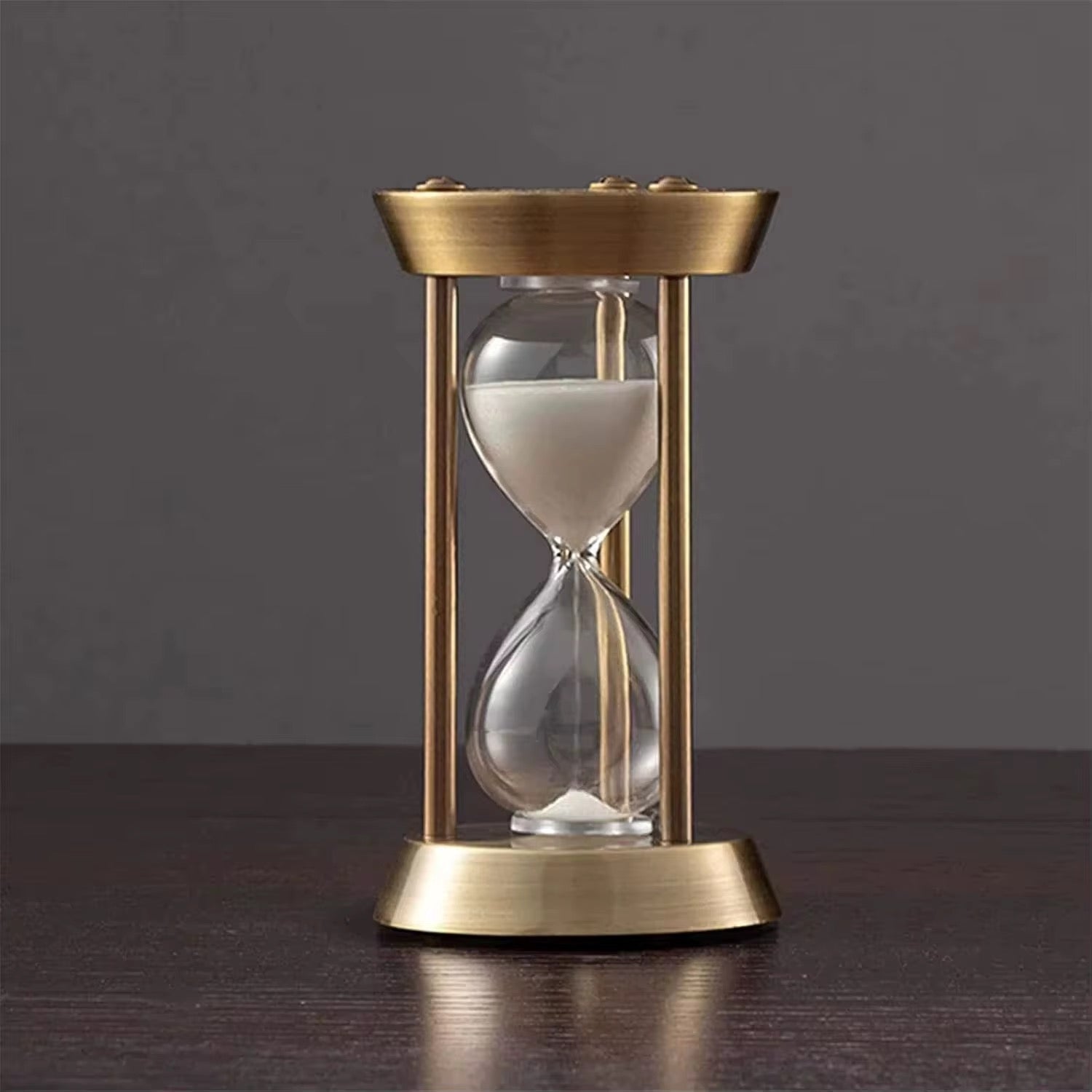 Elevate your décor with this vintage-style brass hourglass, featuring clear glass chambers and fine white sand. A timeless decorative accent for desks, shelves, and study spaces.