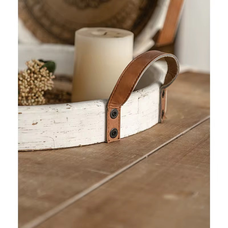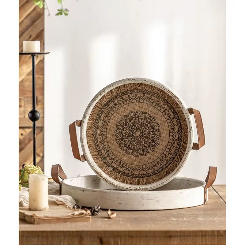This round serving tray set features beautifully carved mandala designs, distressed white edges, and sturdy leather-style handles. Perfect for serving drinks, styling centerpieces, or adding rustic charm to any space.