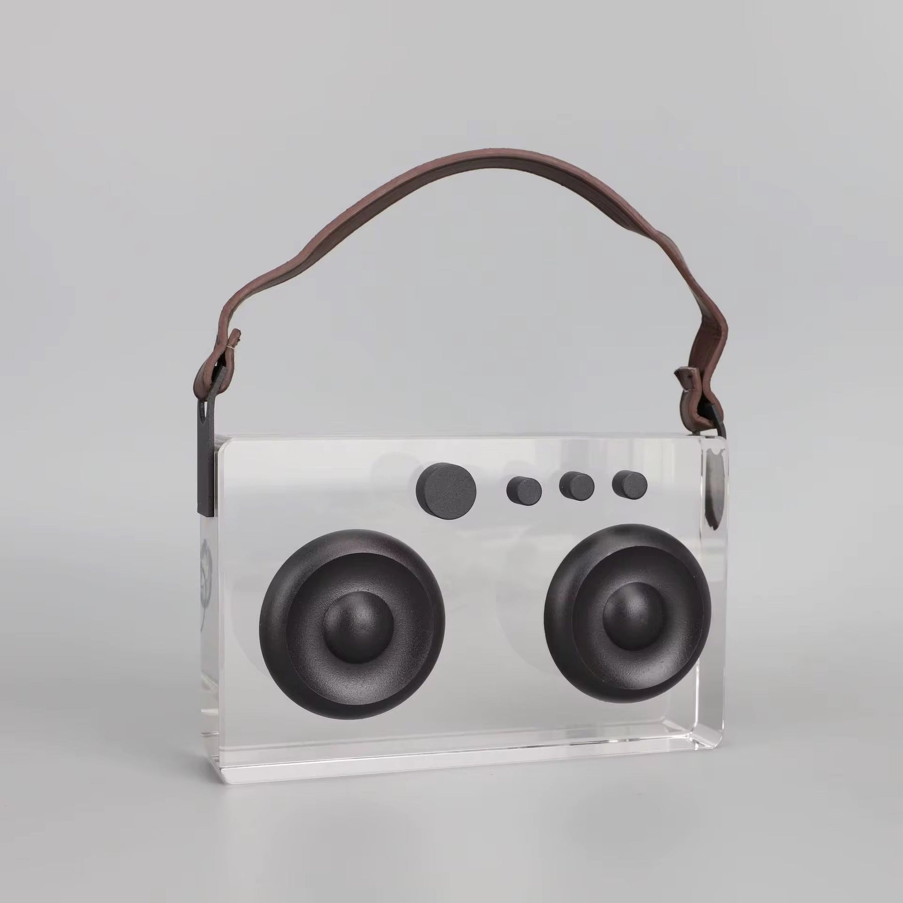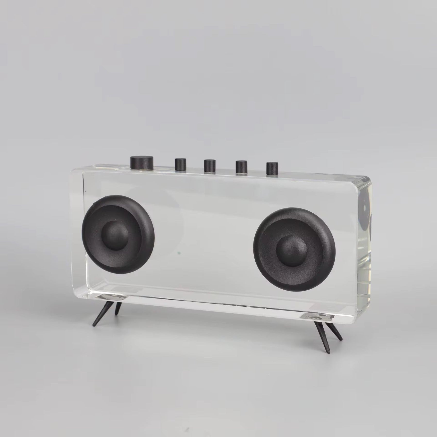 Stylish acrylic decorative speakers featuring a retro design with black dials and accents. Perfect for modern, minimalist, or industrial interiors.