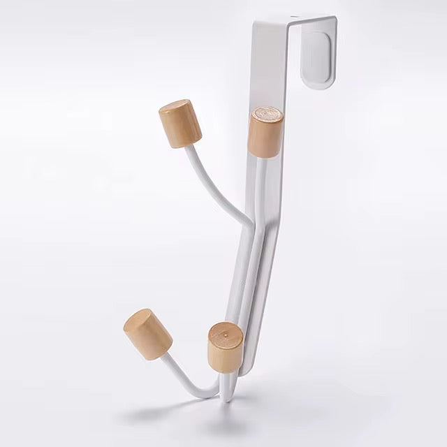 Minimalist wall-mounted hook with wooden tips for coats and accessories.