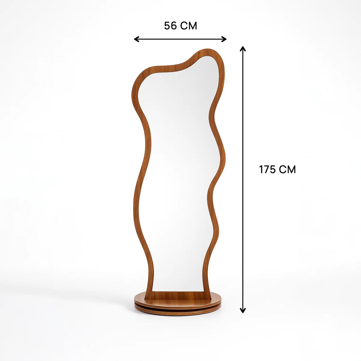 A sculptural full-length floor mirror crafted with a smooth organic silhouette and warm wooden frame. Features integrated rear shelving for stylish, space-saving storage.