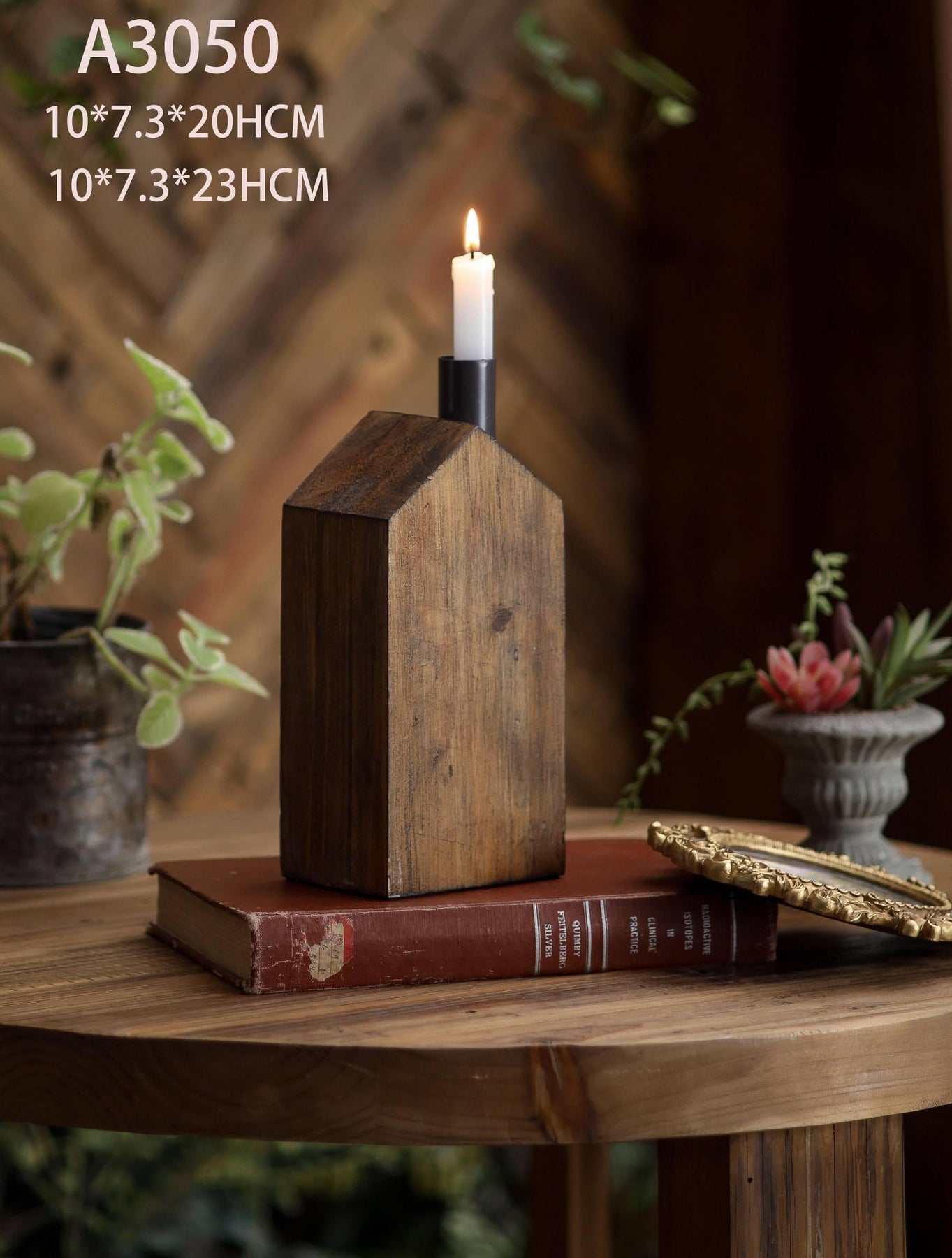 This rustic wooden candle holder features a charming house-shaped design with a metal candle cup. Perfect for adding warm, minimalist farmhouse style to shelves, tables, or cozy corners.