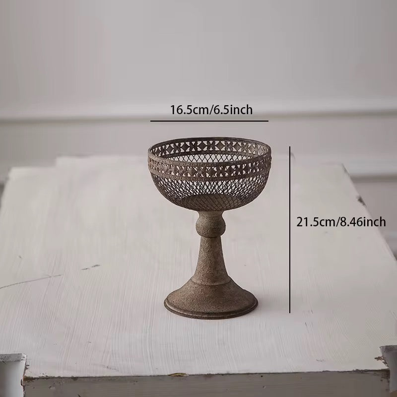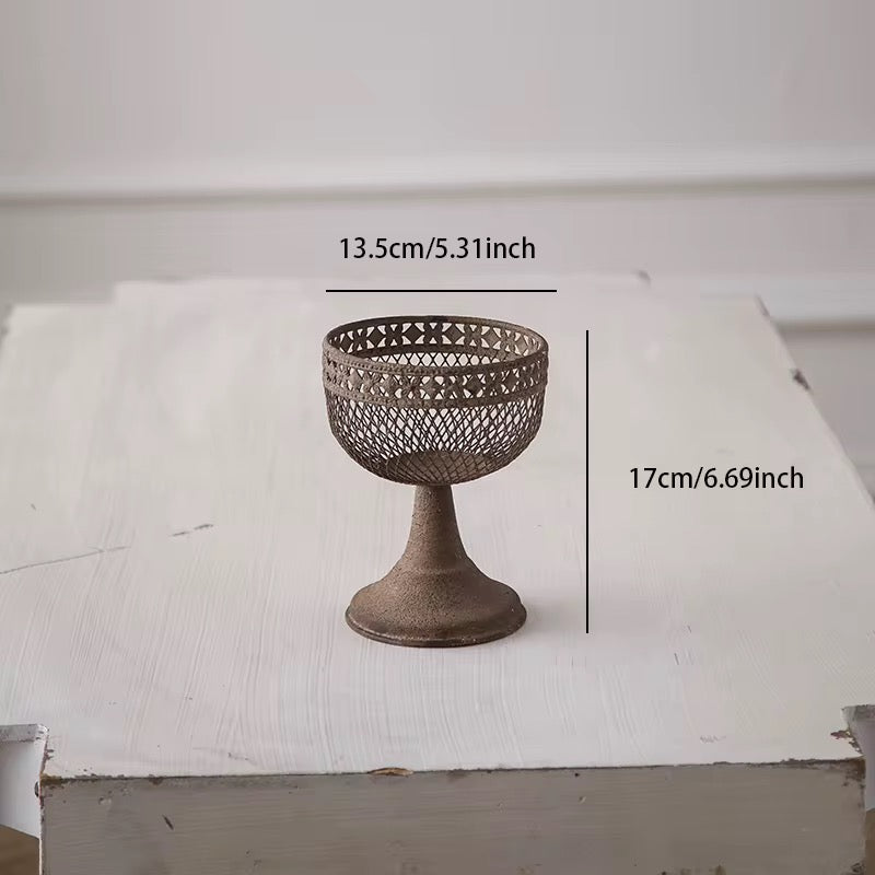 This set of three vintage-style pedestal planters features a rustic metal finish and intricate mesh designs. Perfect for displaying succulents, small plants, or decorative arrangements in any indoor space.