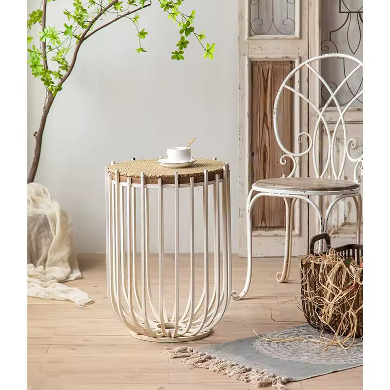 Brighten your space with this airy white metal side table, featuring an open-frame design and a natural woven top for a light, rustic touch.
