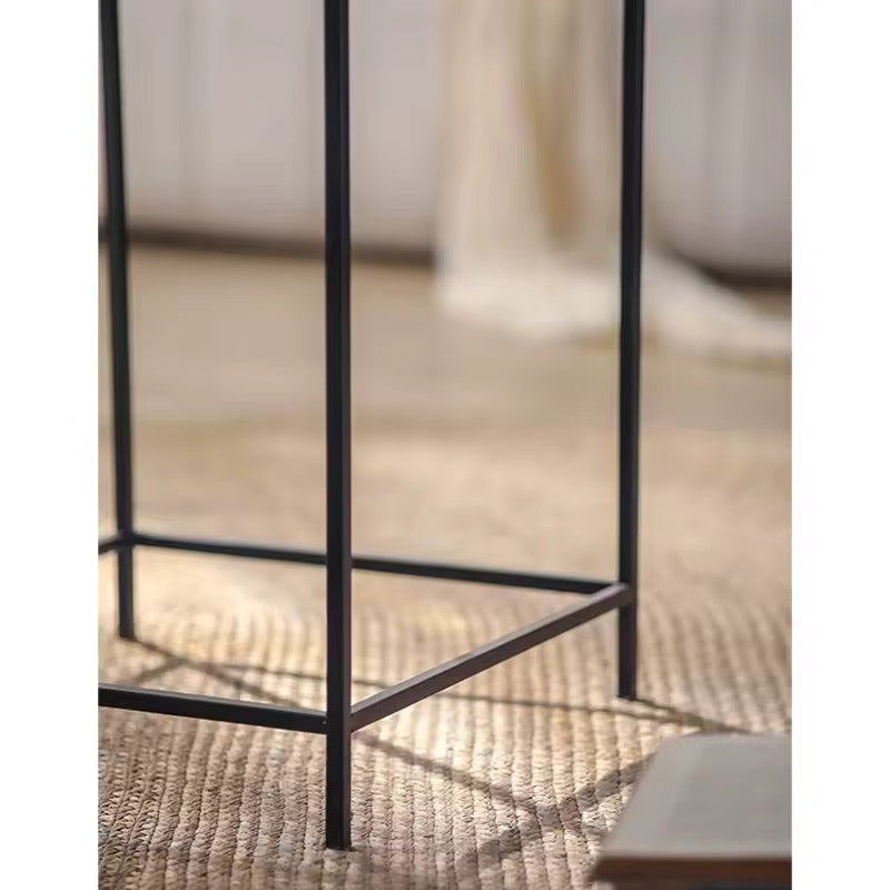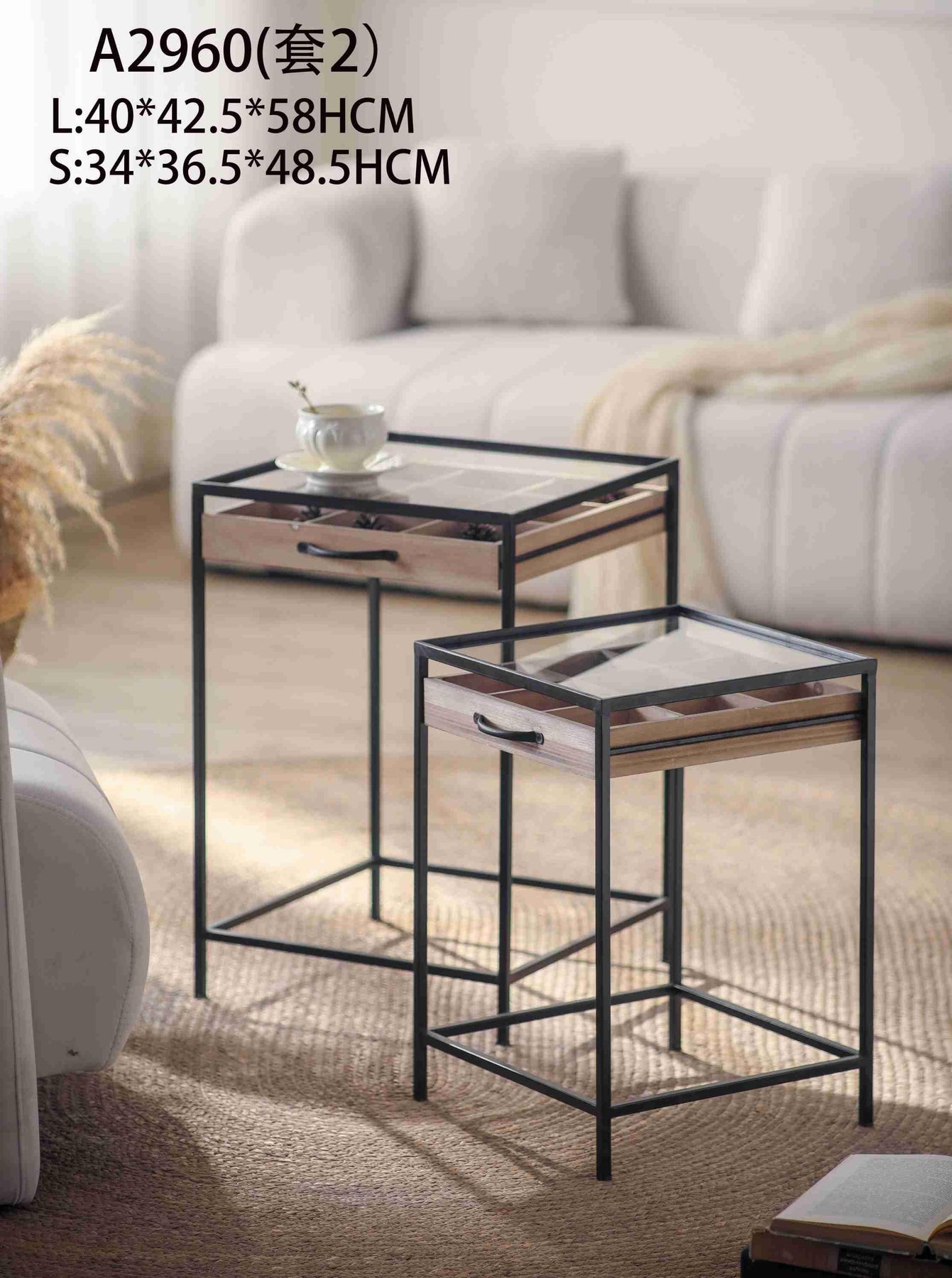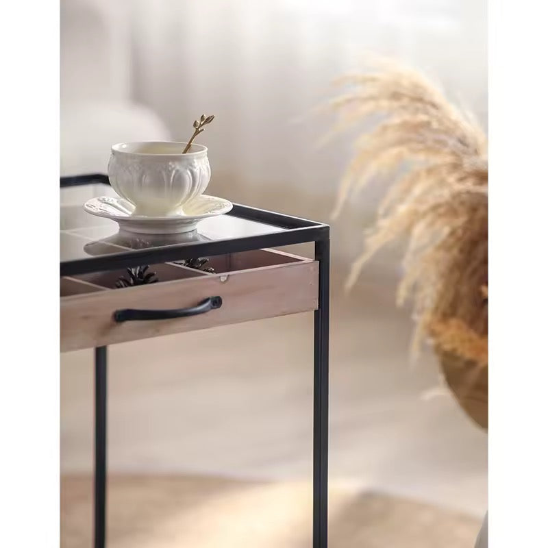This set of two industrial-style side tables features clear glass tops, black metal frames, and wooden tray inserts with compartments. Perfect for modern living rooms, lounges, and multifunctional décor styling.