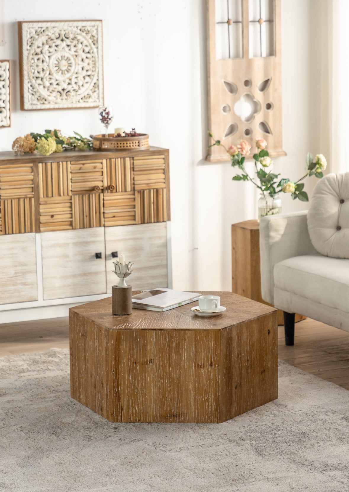 This octagon-shaped rustic coffee table features a solid wood construction with a distressed finish, adding natural warmth and organic charm to any living space. Its geometric form makes it a standout centerpiece for boho, farmhouse, or minimalist interiors.