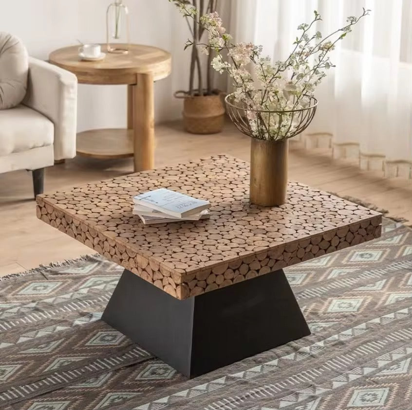 A stunning square coffee table featuring a mosaic-style wooden top and a sturdy geometric base.
