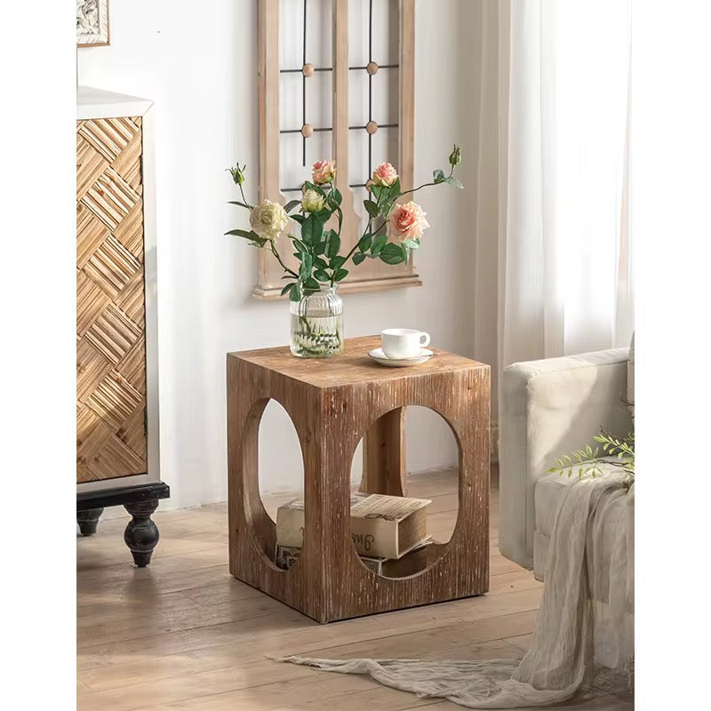 Rustic Wood Cube Side Table with Cutout Design