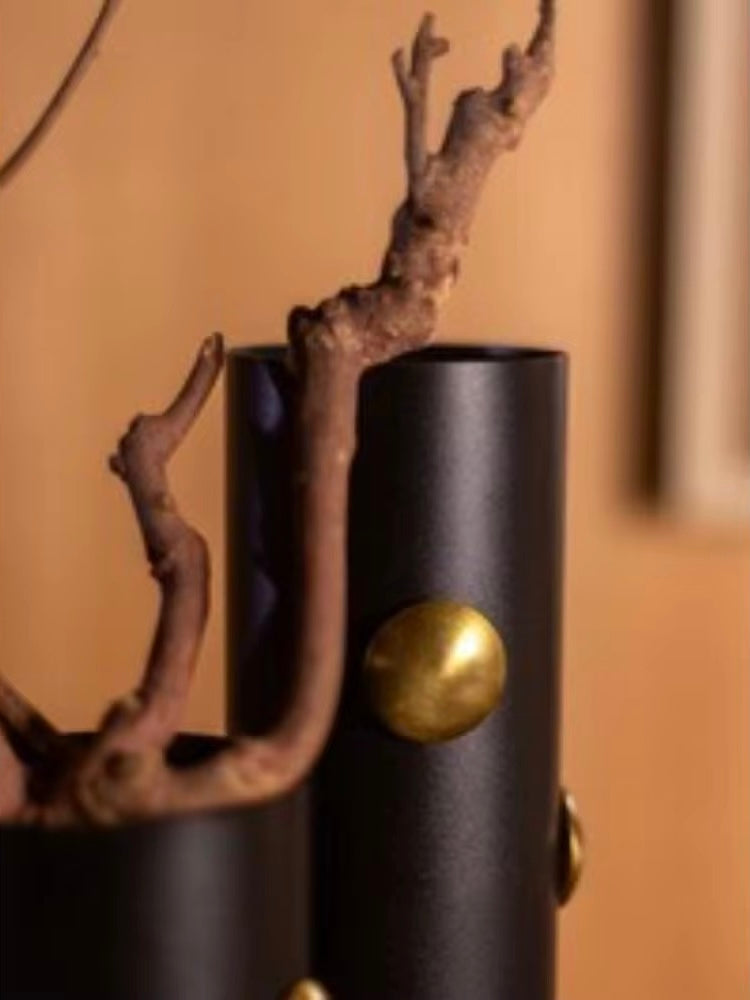 Modern black vases with gold accent detailing.