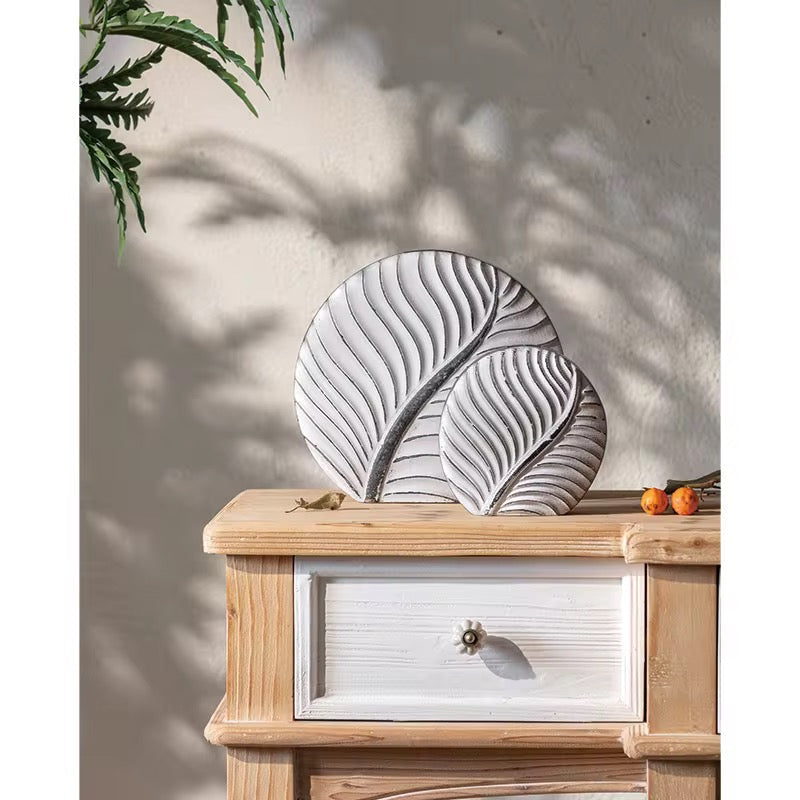 A trio of sculpted ceramic vases featuring an elegant leaf-inspired texture.