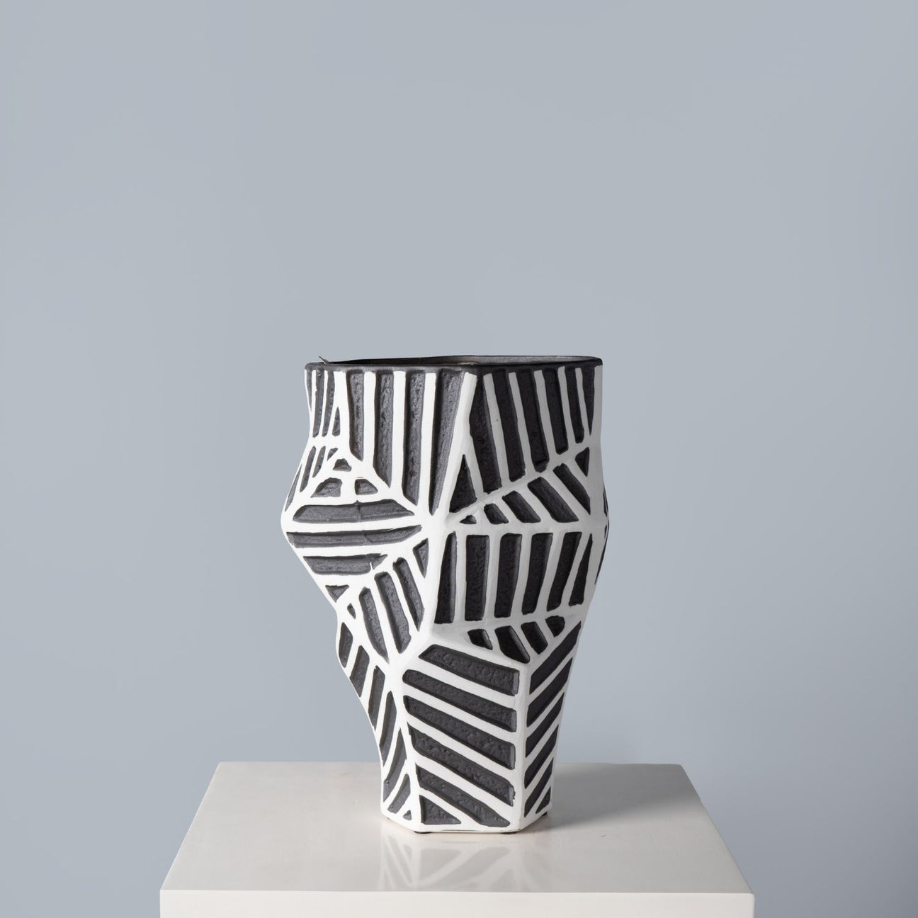 Modern sculptural ceramic vase featuring a bold black and white geometric pattern. Perfect as a statement decor piece for shelves, consoles, or side tables.