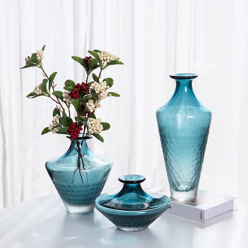 This blue textured glass floor vase features a tall silhouette and subtle surface pattern.