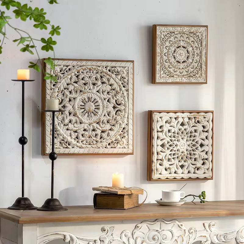 Enhance your decor with this vintage carved wood wall art set, featuring intricate floral patterns and distressed finishes for timeless elegance.