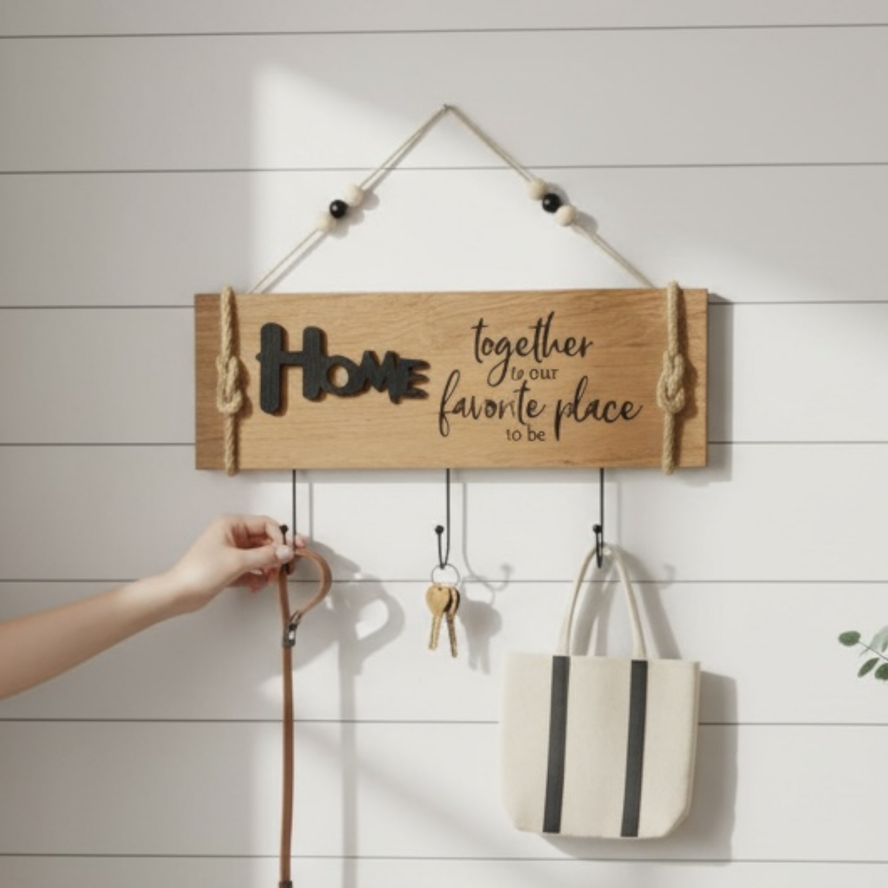 Create a warm and organized entryway with this rustic wooden key holder. Designed with natural wood, decorative rope hanging, and strong black metal hooks, it combines everyday functionality with cozy home décor charm.