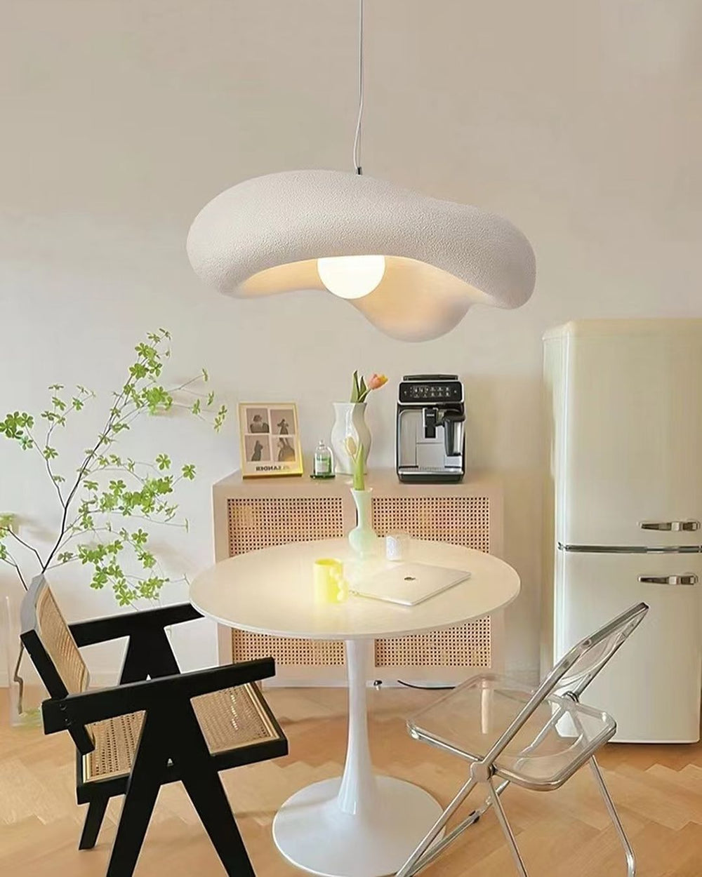 This Organic Wave Pendant Light features a unique, flowing shape with a white textured finish. Its artistic and modern design makes it a standout piece for kitchens, dining areas, or living spaces. The open design with an exposed bulb provides both functional and ambient lighting, adding a soft glow to any room.