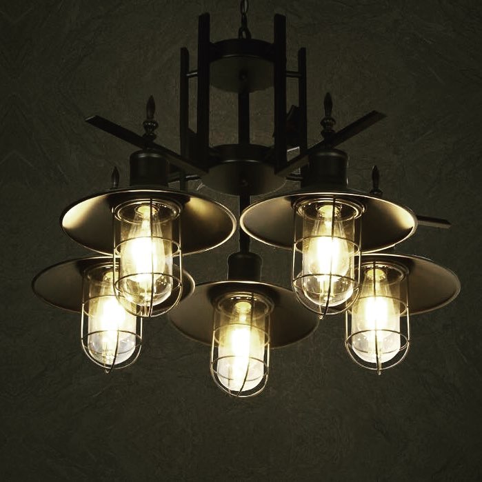 This industrial-style chandelier features a sturdy black metal frame and five caged glass shades, creating a warm and inviting ambiance. Perfect for adding a vintage industrial touch to your living or dining room.