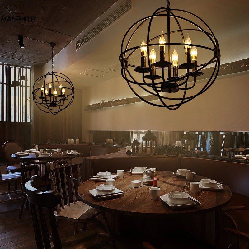 Create a warm and inviting ambiance with this rustic orb chandelier. Featuring a black spherical frame with candle-style bulbs, it's perfect for dining areas or rustic interiors.