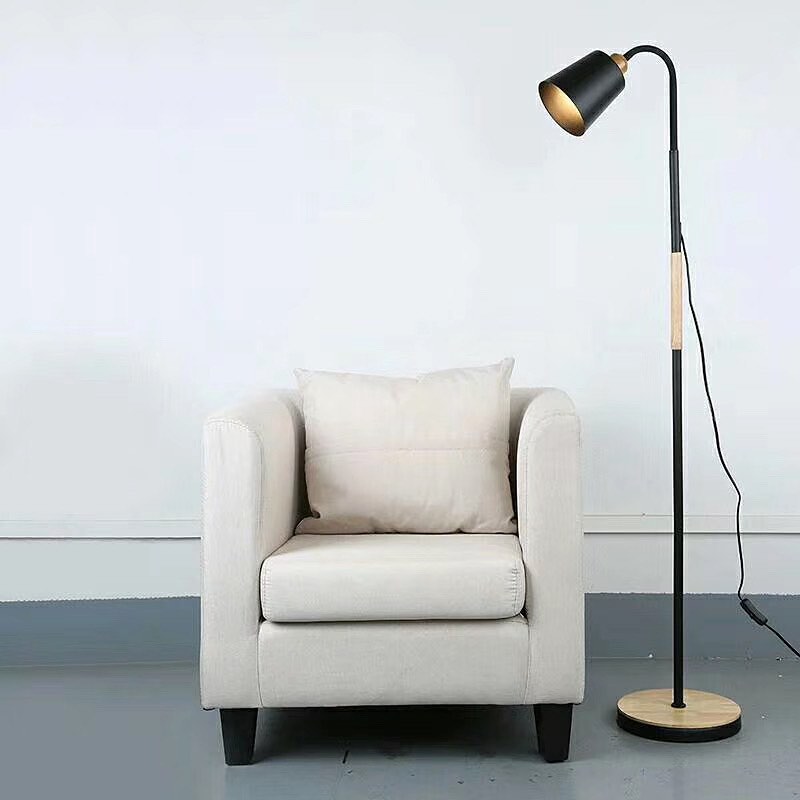 This modern black and wooden floor lamp with an adjustable head provides focused lighting, making it perfect for reading or highlighting specific areas in a room.
