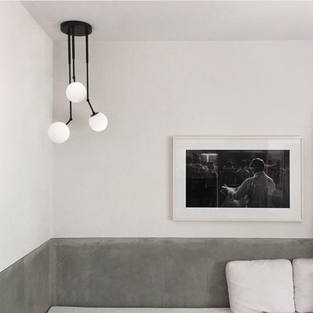 Bring a minimalist and modern touch to your interiors with this pendant light. Featuring three white globe shades suspended from a sleek black frame, it's an ideal choice for contemporary spaces like bedrooms or home offices.