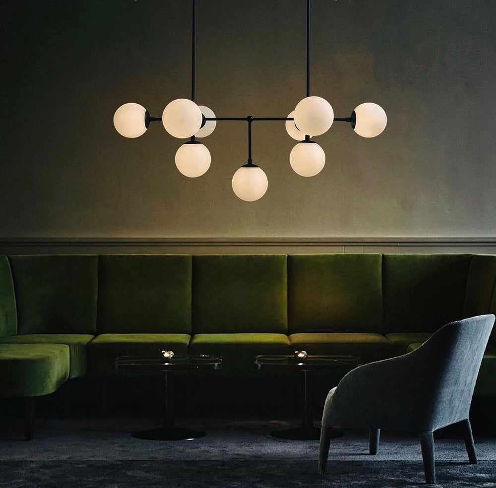 Elevate your living or dining space with this contemporary branch-style chandelier. Featuring multiple white globe shades and a sleek black metal frame, this fixture adds elegance and ambient lighting to any room.