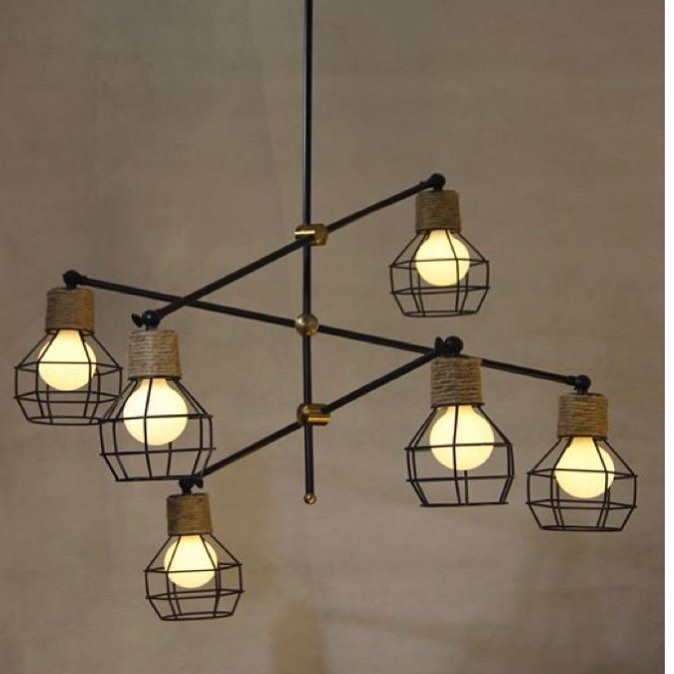 This rustic industrial chandelier features six wire cage shades and a black metal frame with rope details, perfect for adding character to dining or living rooms.