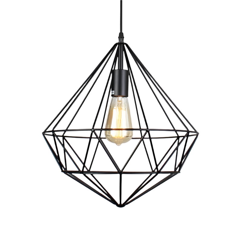 This geometric pendant light features a black metal frame, offering a modern and industrial design.