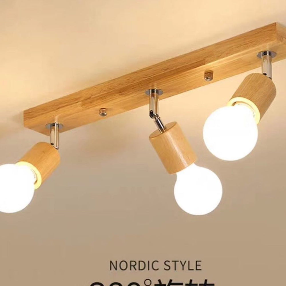 A natural wooden spotlight fixture with three adjustable heads, perfect for accent lighting in modern homes.