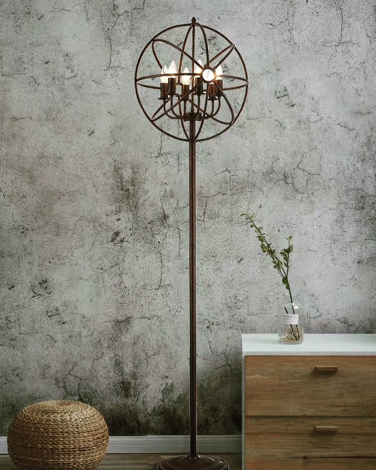 Elevate your home decor with this rustic metal orb floor lamp, featuring a vintage-inspired candelabra design enclosed within a spherical frame. Ideal for adding character and charm to your living space.