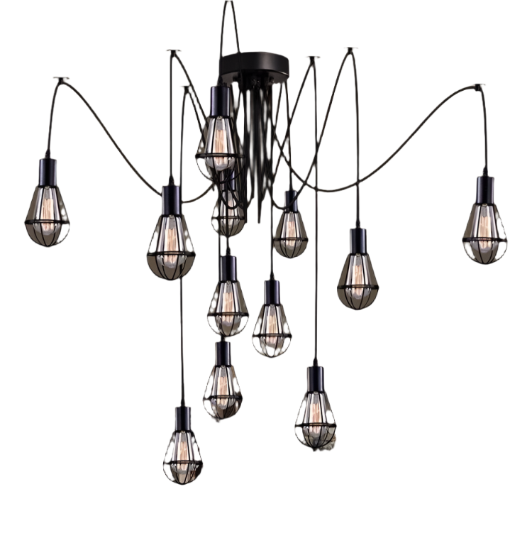Make a bold statement with this industrial multi-light pendant chandelier. Featuring ten black wire cage shades and exposed filament bulbs, this fixture creates a dramatic and stylish atmosphere. Perfect for dining areas, living rooms, or loft-style interiors.