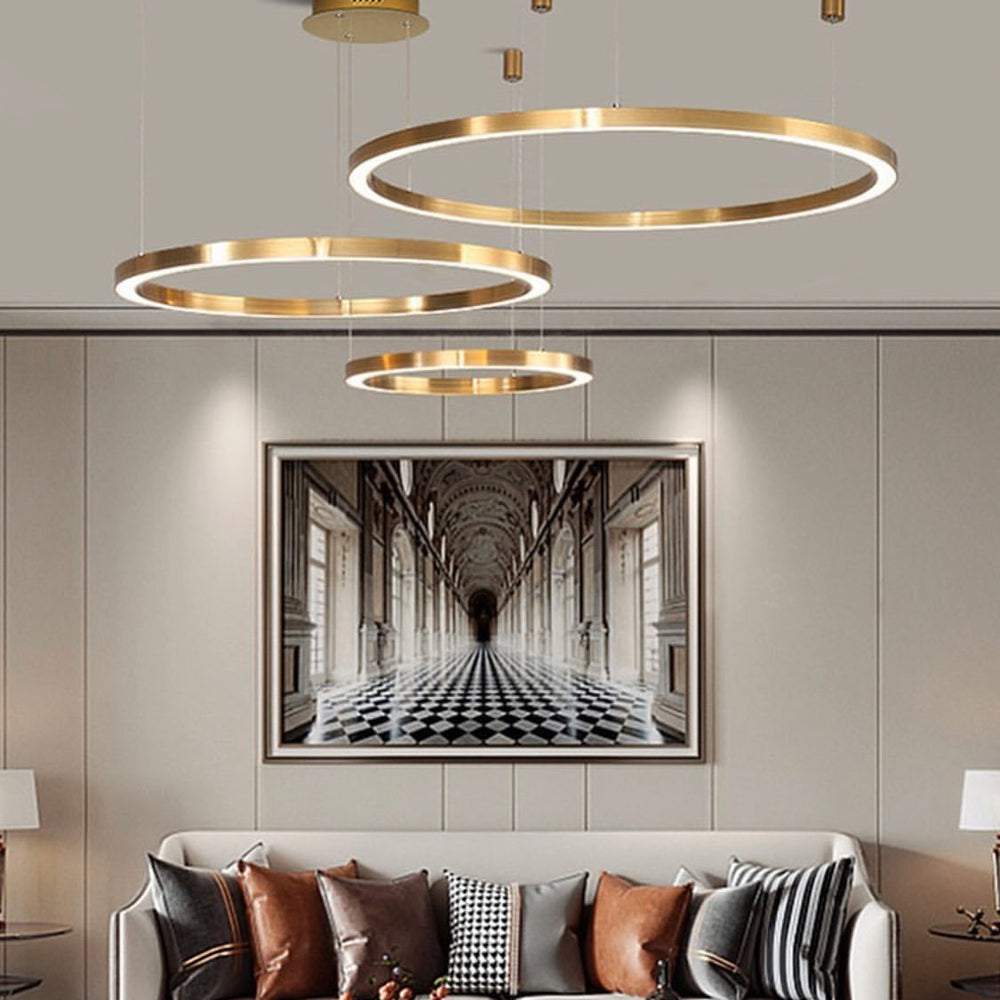 Illuminate your space with this elegant modern LED ring chandelier. Featuring multiple gold-finished rings suspended at varying heights, this fixture adds a luxurious and contemporary touch to living rooms, dining areas, or grand entryways. Perfect for creating ambient lighting.