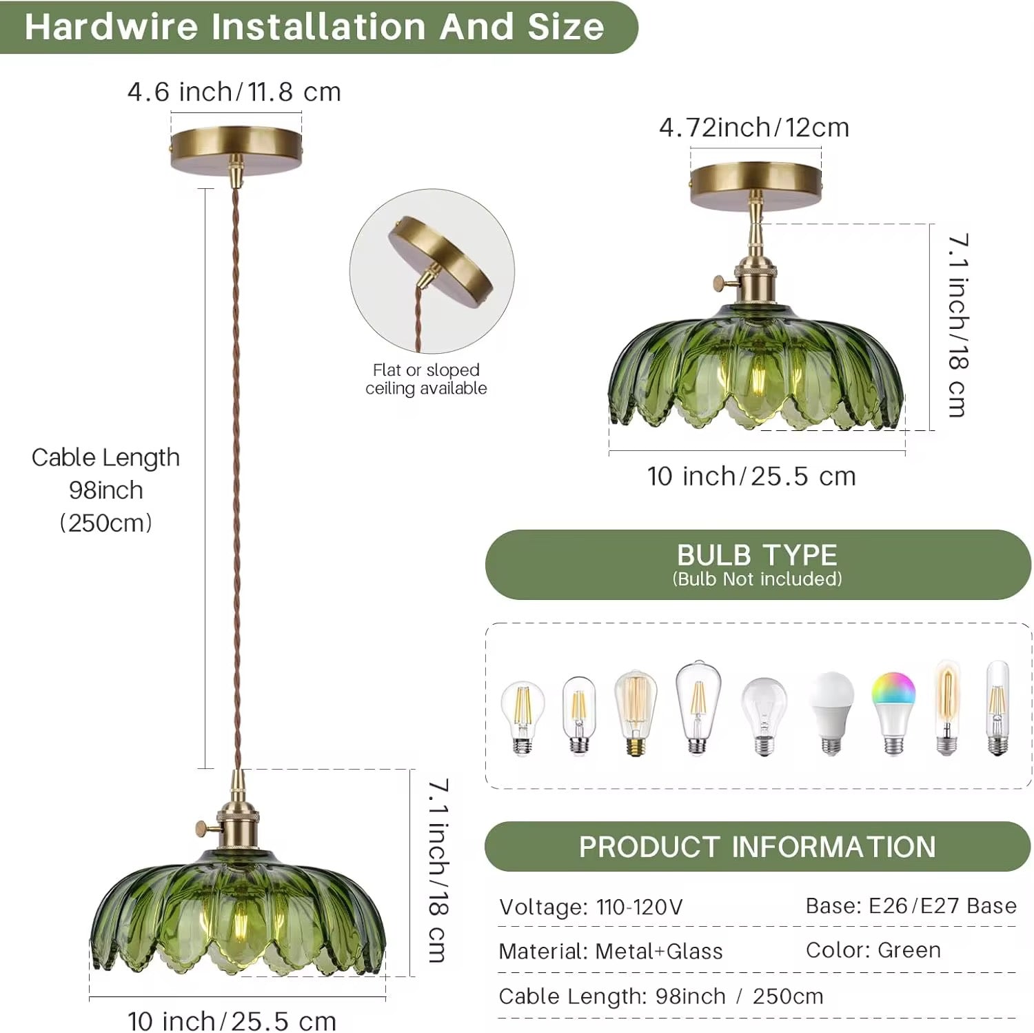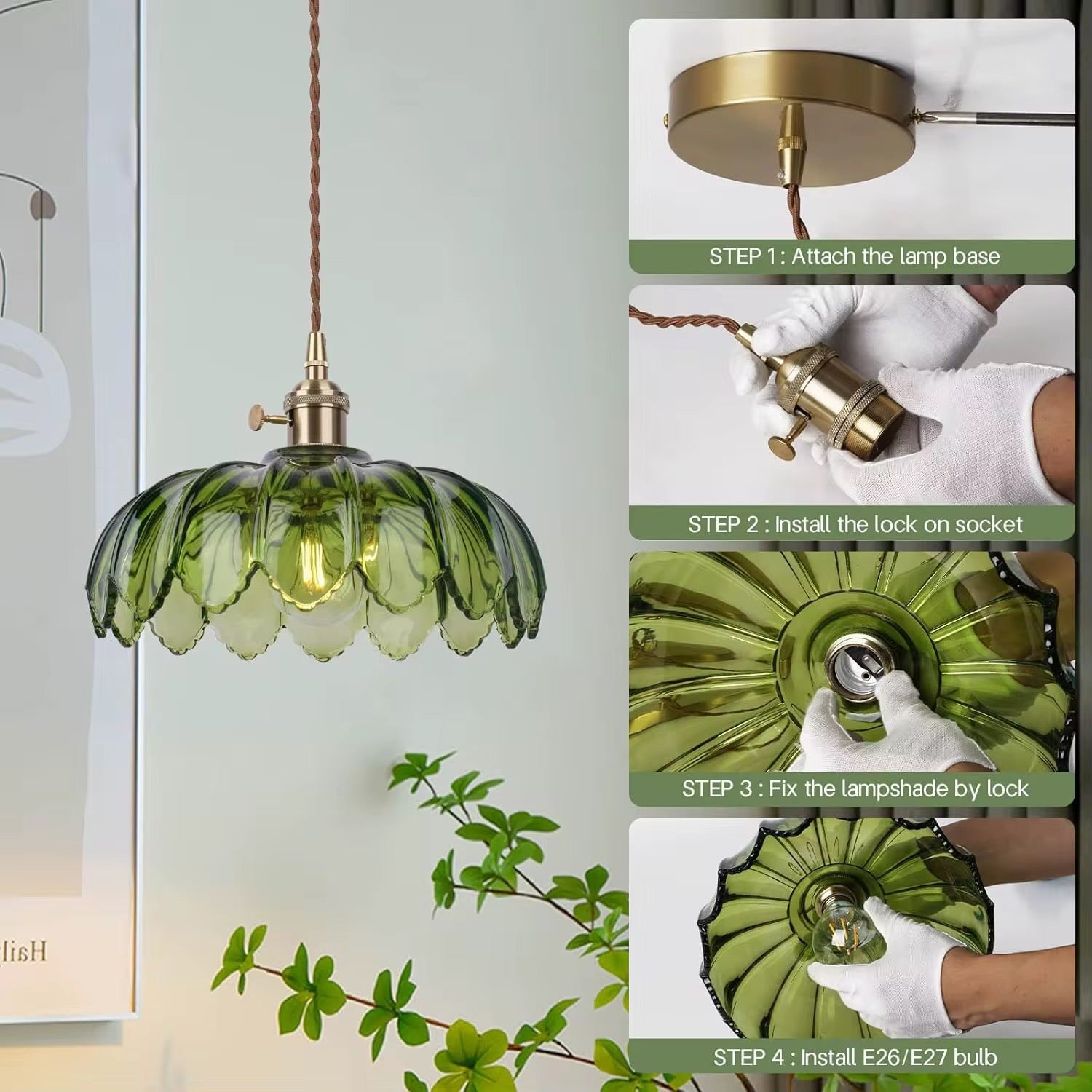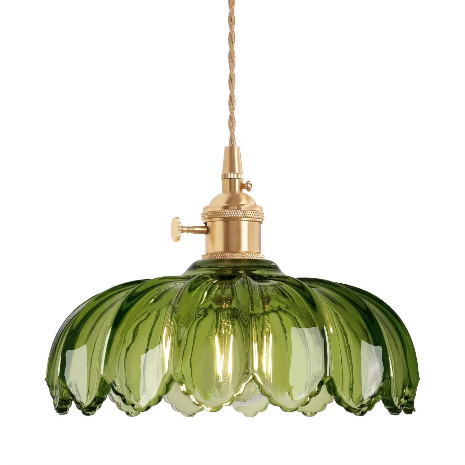 Elegant pendant lamp with scalloped green glass shade that softly diffuses warm ambient light.