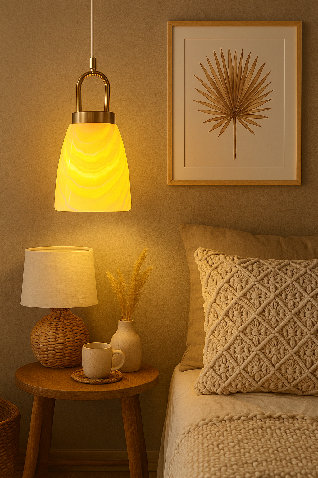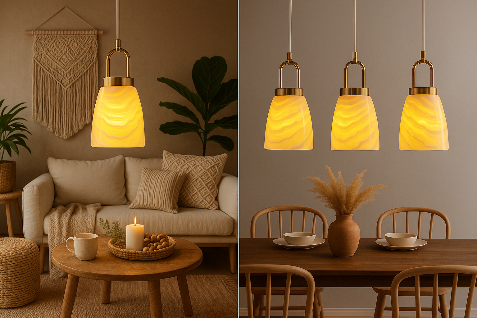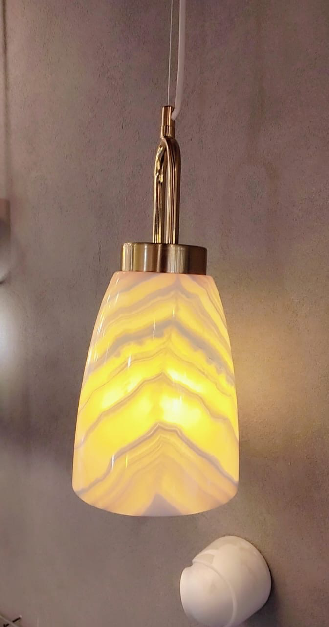 A refined mini pendant featuring a glowing alabaster-style shade and brushed brass hardware—ideal for adding warm, elegant illumination to intimate spaces.