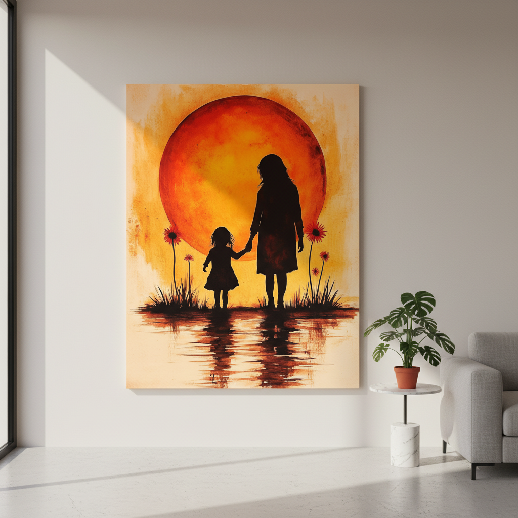 This emotional canvas artwork captures the touching silhouette of a mother holding her daughter’s hand beneath a glowing sunset. The warm orange sun and reflective water create a peaceful and heartfelt atmosphere that celebrates the special bond between mother and child.