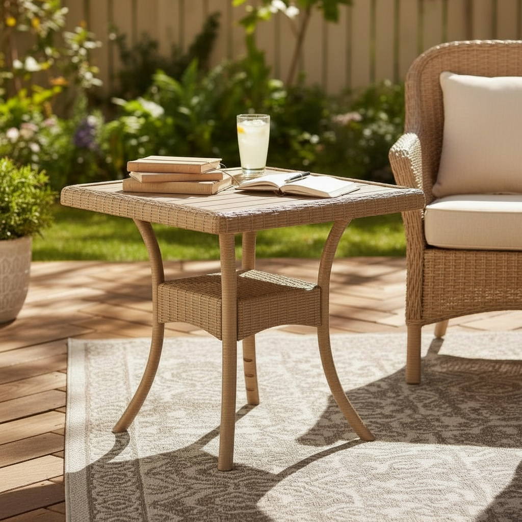 This natural woven outdoor side table adds warmth and timeless style to patios, gardens, and outdoor seating areas. Crafted with a weather-resistant woven structure and a convenient lower shelf, it’s perfect for books, drinks, and everyday outdoor essentials.