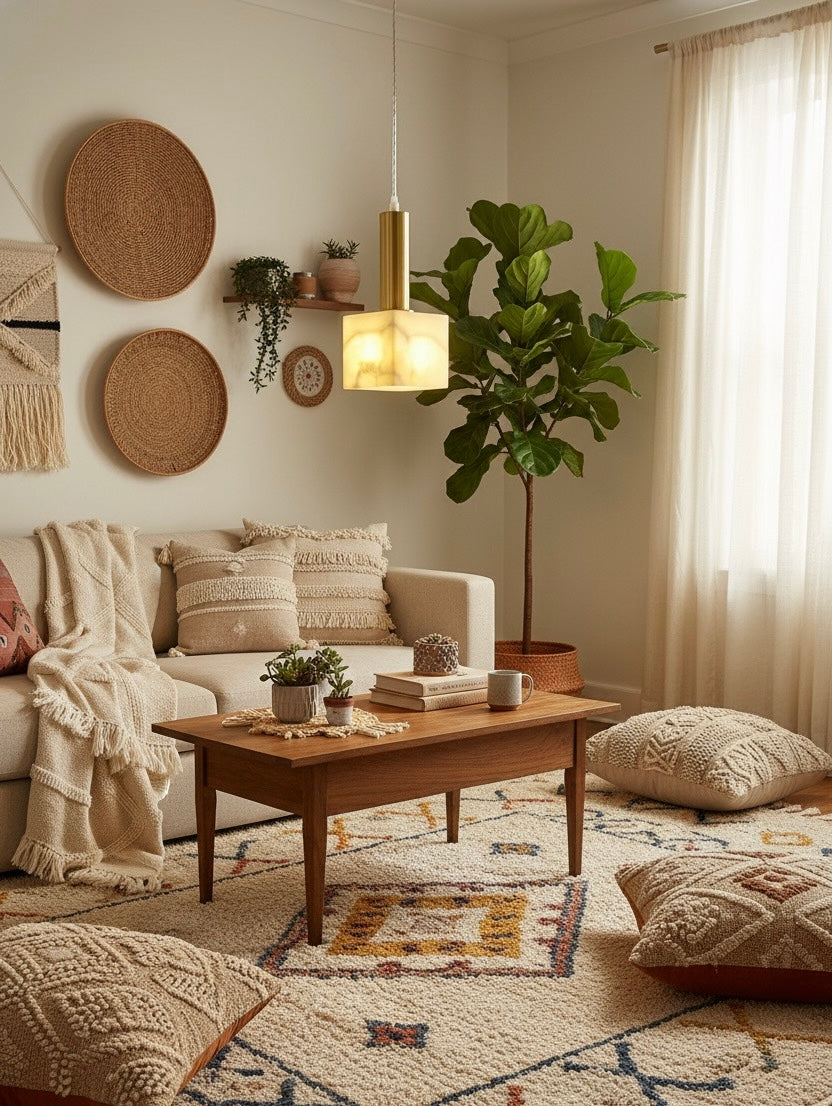 A modern pendant light featuring a warm glowing onyx-style cube shade paired with a sleek brass finish. Perfect for adding elegant ambient lighting to any contemporary space.