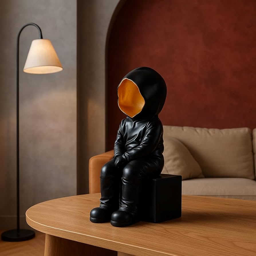 Introduce bold modern art into your space with this black hooded faceless sculpture, featuring a striking gold interior and a seated design that adds depth and intrigue to any room.