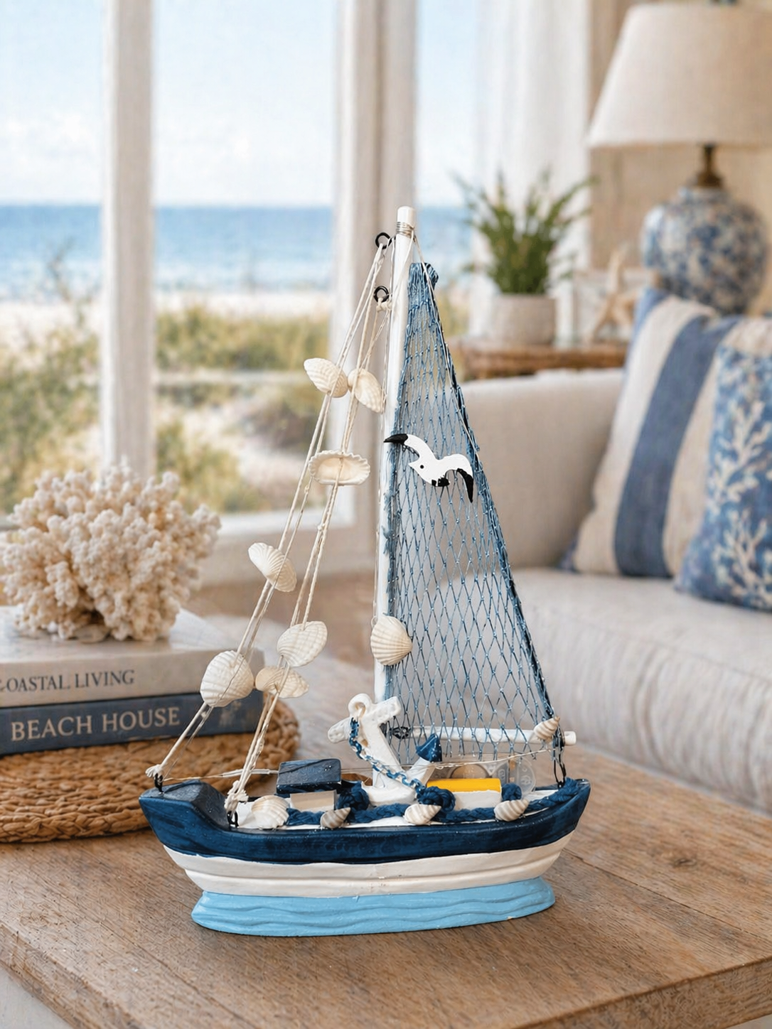 Bring coastal charm into your home with this nautical sailboat decor piece. Featuring a classic white and navy design with a ship wheel emblem, it’s perfect for enhancing beach-inspired or nautical-themed interiors.