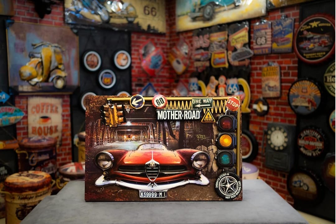 Add bold vintage flair to your décor with this 'Mother Road' retro wall art, featuring a striking red classic car, traffic signs, and layered urban textures for an authentic nostalgic vibe.