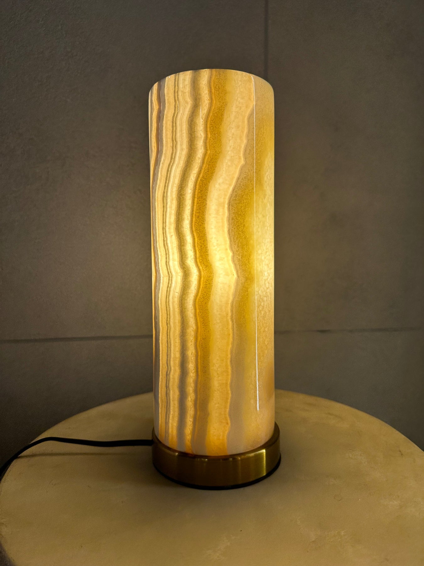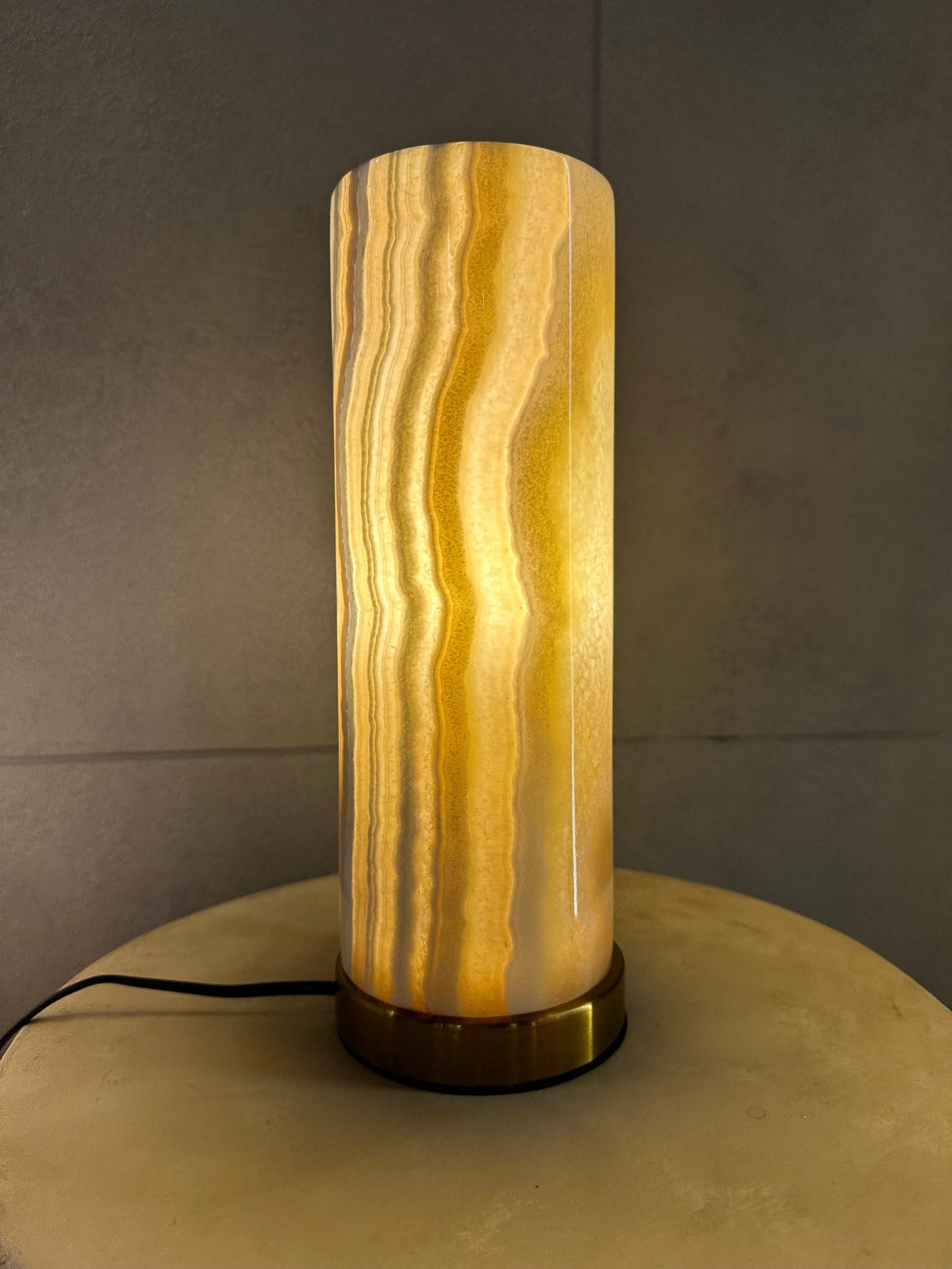 Stylish tall table lamp featuring a marble-effect cylindrical shade with warm natural tones. Perfect for creating an inviting atmosphere in bedrooms, living rooms, or cozy corners.