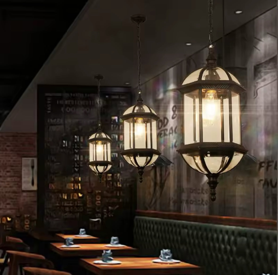 These vintage lantern pendant lights feature a classic design with metal frames and glass panels, perfect for creating a warm and inviting atmosphere in restaurants, cafes, or dining spaces. The timeless look complements various interior styles while providing ambient lighting.