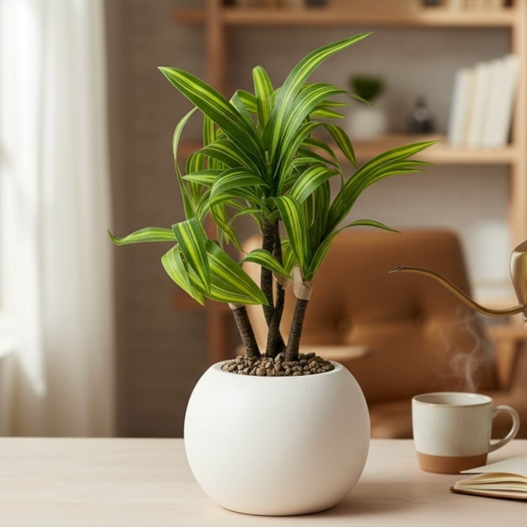 Bring a touch of freshness to your home with this lifelike artificial Dracaena plant. Placed in a smooth white round pot, it adds a modern and natural accent to any space — perfect for desks, shelves, or living areas.