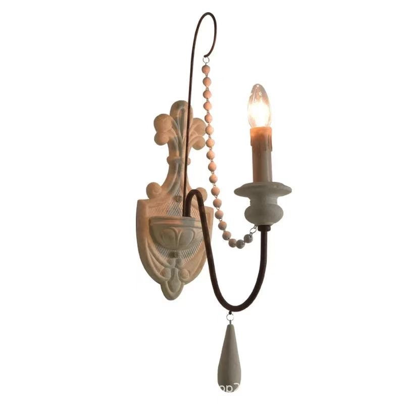 This elegant rustic wall sconce features a charming candle-style design with a distressed white finish and decorative beads. Perfect for creating a cozy, vintage-inspired ambiance in your hallway, bedroom, or living space. Its artistic craftsmanship adds a touch of timeless elegance to any room.