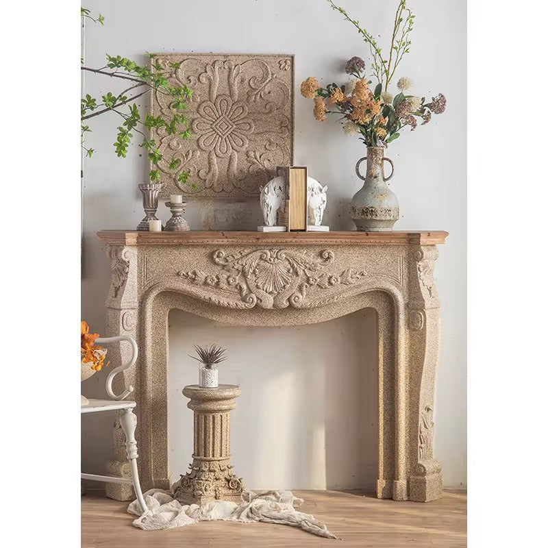 Create a grand statement in your space with this vintage-style faux stone fireplace console. Featuring intricate carvings, a warm-toned top, and a majestic sculptural design, it blends classical charm with decorative functionality.