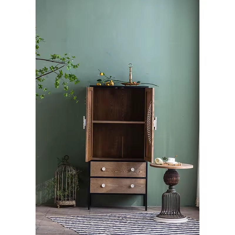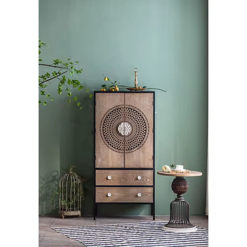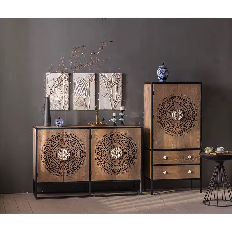 Infuse your space with artistic flair using this mandala carved wood cabinet. The intricate circular pattern on the doors is paired with modern lines and functional drawers, making it a striking yet practical statement piece.