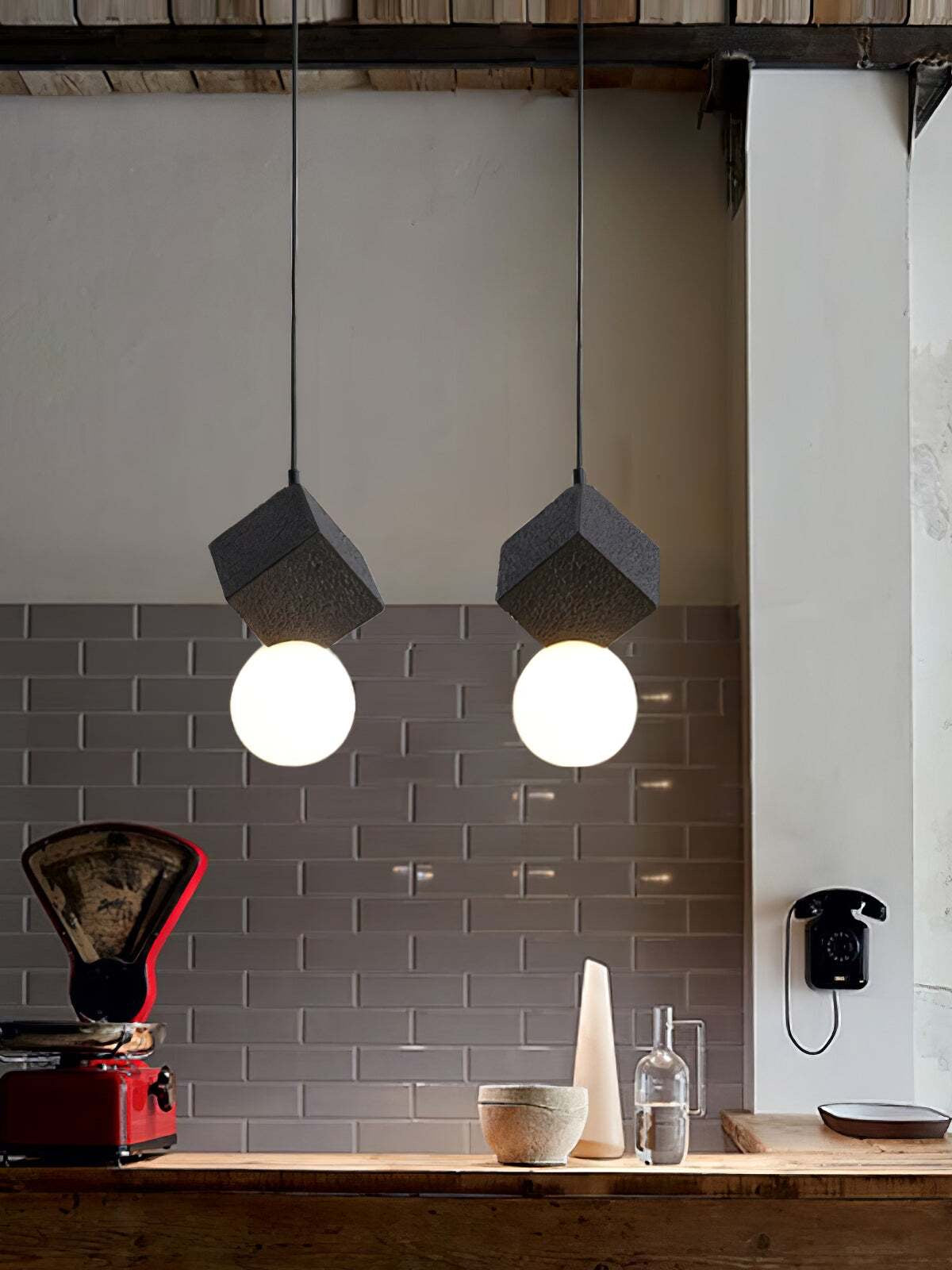 Modern pendant lights featuring cube-shaped holders with glowing globe bulbs. A creative mix of colors and textures for stylish, contemporary interiors.